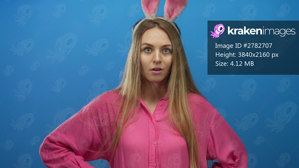 Woman with long hair wearing rabbit ears and pink shirt against isolated blue background, exudes playful easter energy.