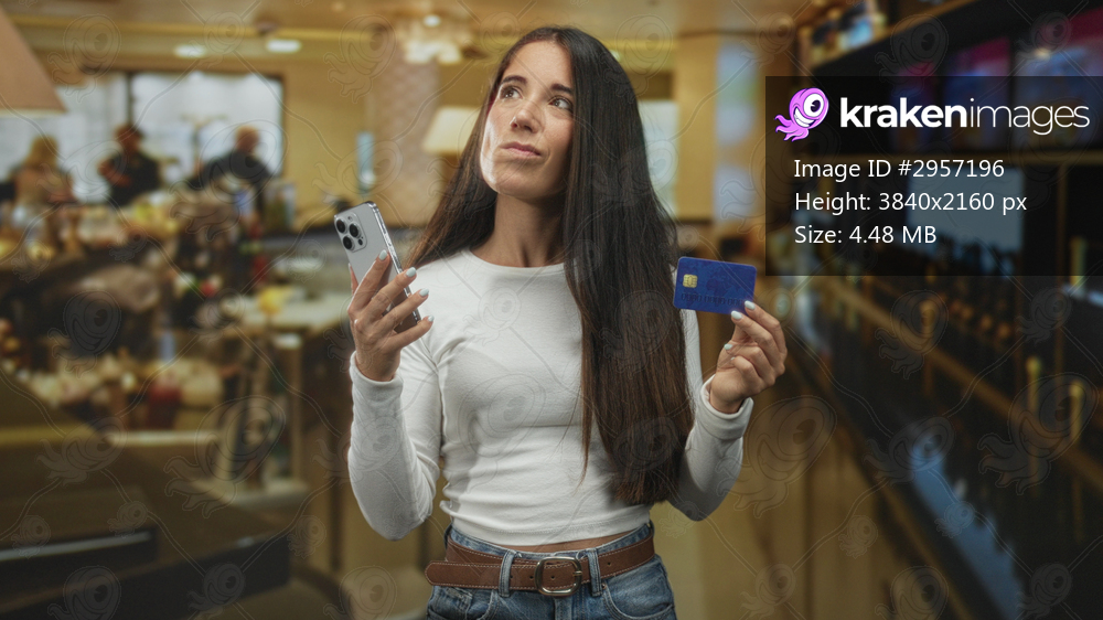Woman with long hair wearing white top holding smartphone and creditcard in raised hands at a bar counter inside a building; mobile payment confidence. - Kraken Images
