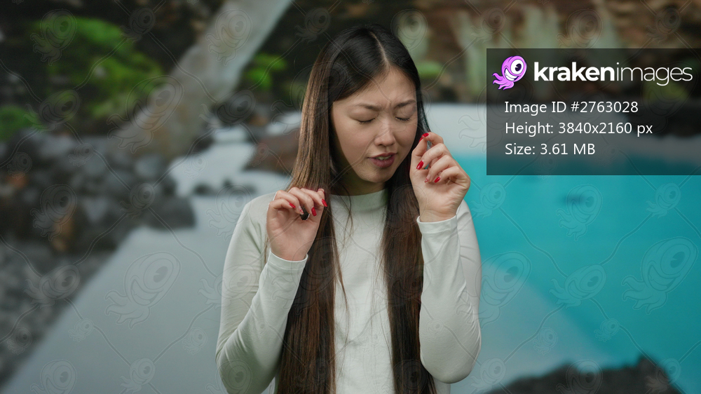 Woman with long hair and white shirt appears disgusted near a swimming pool at a luxurious resort, emphasizing her expressions in the sunny outdoor setting. - Kraken Images