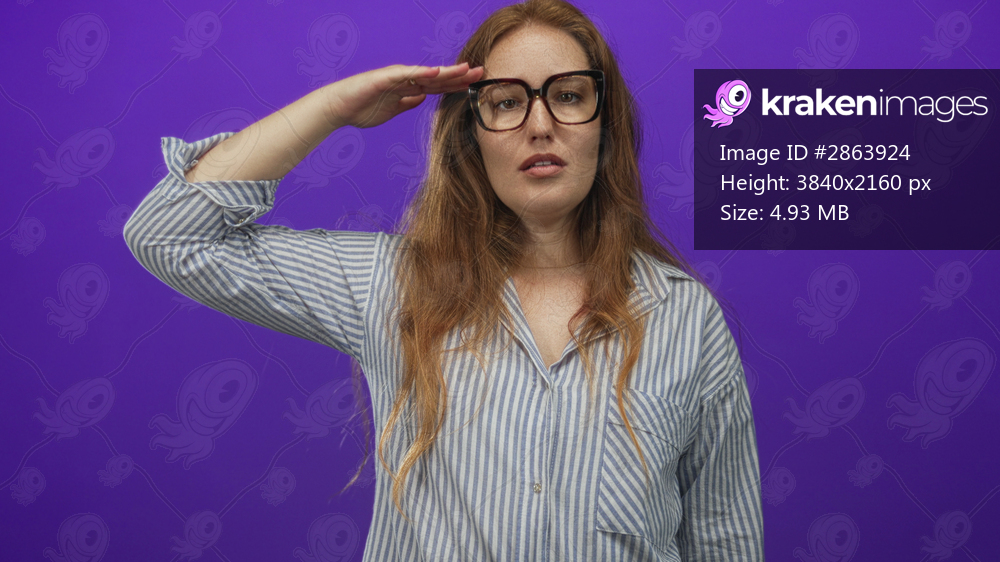 Woman with long red hair in striped shirt and glasses salutes with right hand against purple studio wall; duty honor loyalty respect.