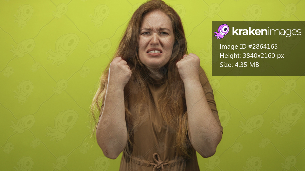 Woman with long red hair and open mouth yelling intensely in studio against a lime green background; anger frustration.