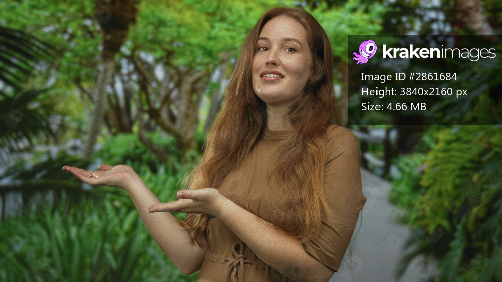 Woman with long red hair and palms up gesture wearing brown dress in sunlit forest; serenity invitation.