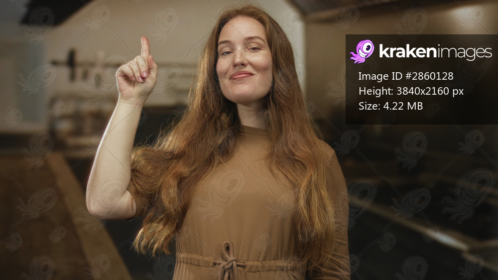 Woman with long red hair pointing finger to stainless steel stove in cozy kitchen while smiling; inspiration.