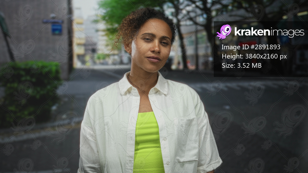 Woman looking at camera wearing neon green top on street with storefronts and trees; confidence resilience independence.