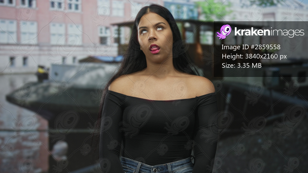 Woman looking down beside a moored canal boat on a bustling city street lined with historic buildings; contemplation.