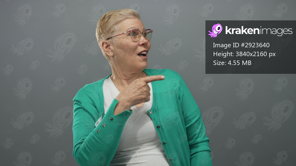 Woman looking right with open mouth and glasses wearing green cardigan and white v neck shirt in gray studio; surprise wonder.