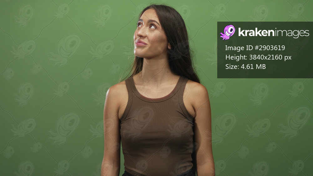 Woman looking up with bare shoulders and long brown hair wearing a brown tanktop in green studio; contemplation.