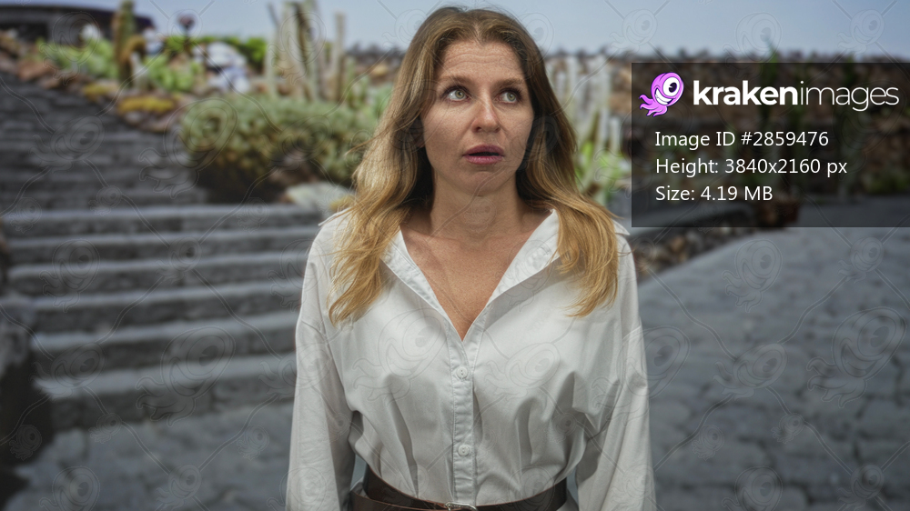 Woman looking up with mouth open in park on cobblestone path by stone steps and potted succulents; annoyed impatience.