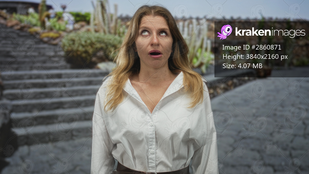 Woman looking up with mouth open in park on cobblestone path by stone steps and potted succulents; annoyed impatience.