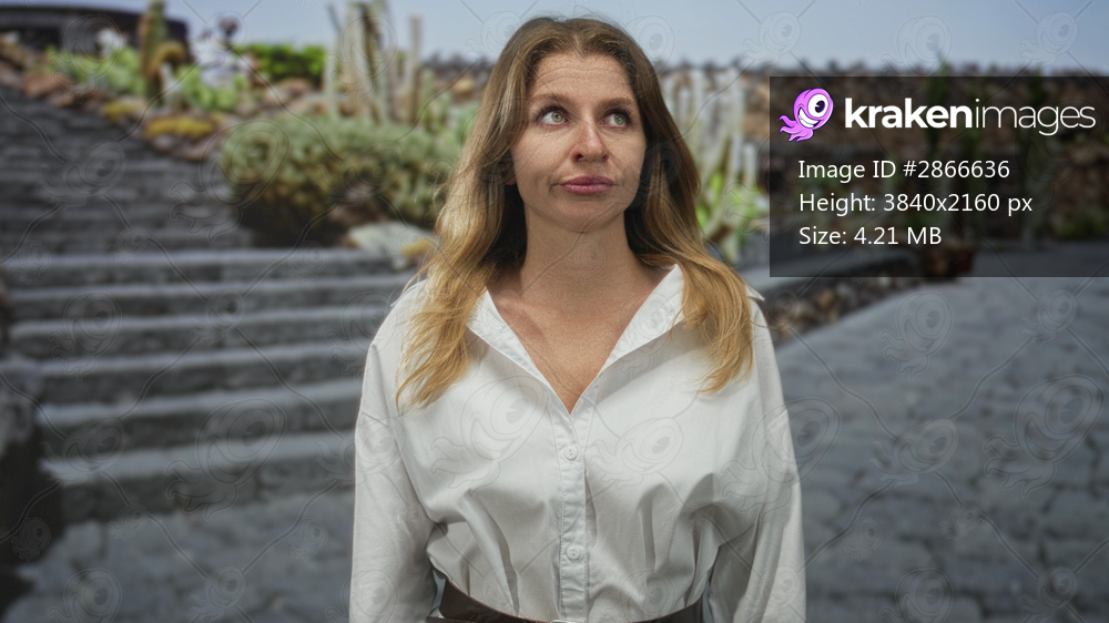 Woman looking up with mouth open in park on cobblestone path by stone steps and potted succulents; annoyed impatience.