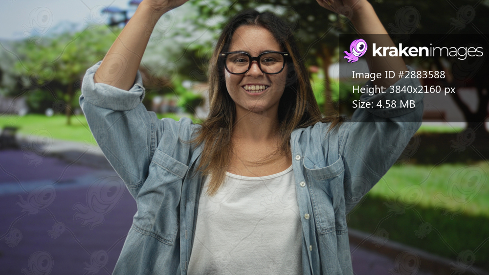 Woman looking up with raised arm and visible face on street, glasses and denim shirt, upper chest exposed; confidence reflection.