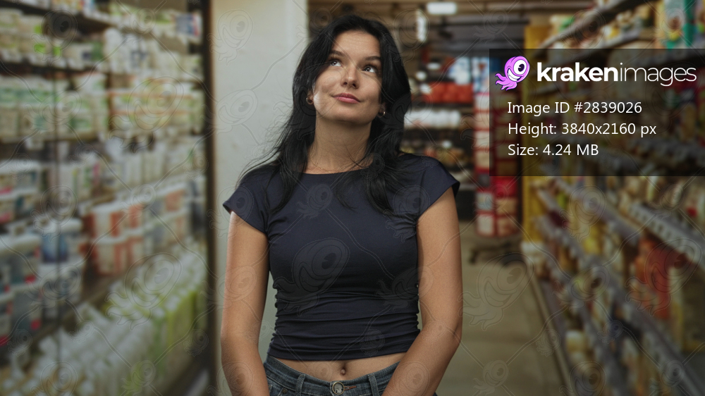 Woman looking up with visible bellybutton in colorful supermarket aisle amid grocery shelves; curiosity.