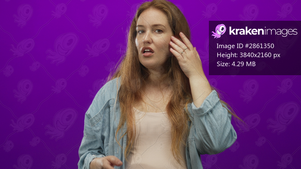 Woman looks dissatisfied as she touches her long hair against a purple backdrop in a studio session; insecurity.