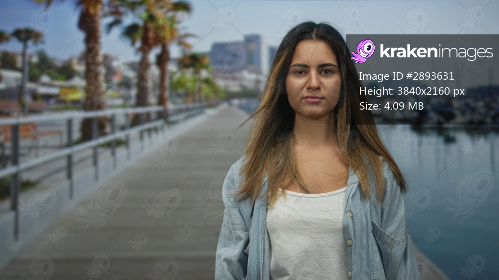 Woman looks sideways on street near boats and marina walkway, hair blowing in wind; quiet contemplation.