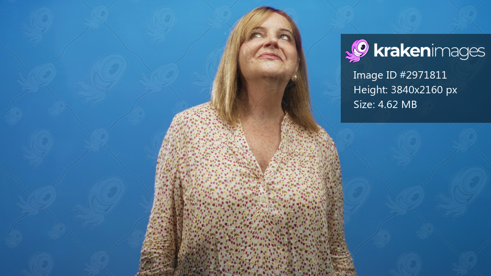 Woman looks upward with slight smile, visible neck and shoulders, standing in studio with blue backdrop; hopeful reflection.