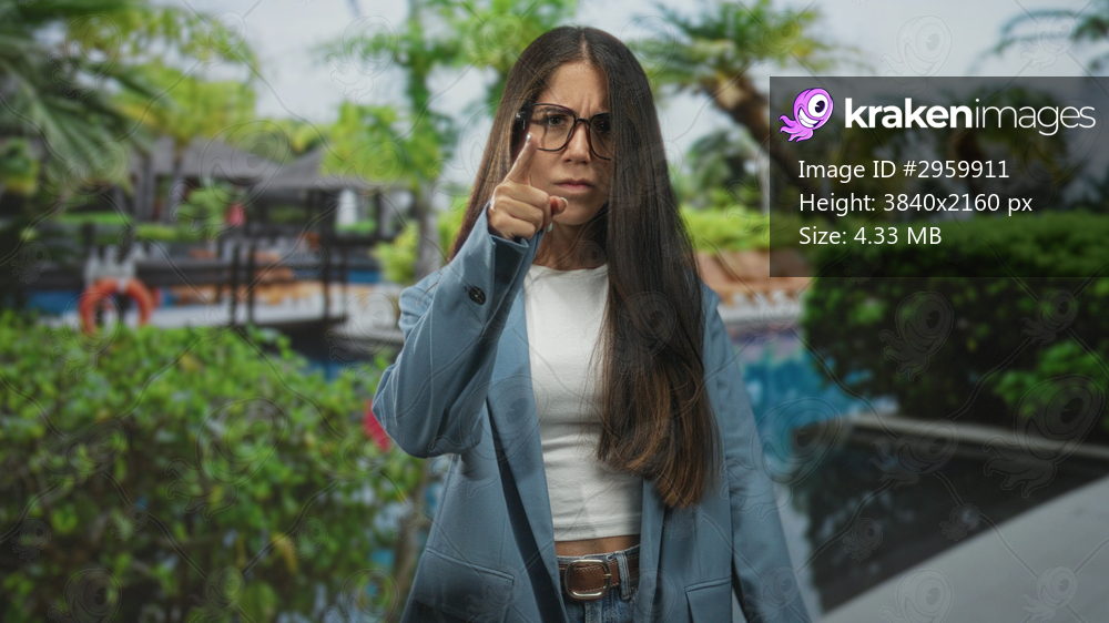 Woman makes a defensive hand block gesture with hands near face and fist by palm at a poolside building; self defense determination.