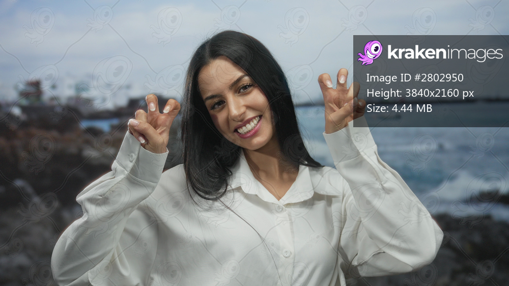 Woman makes air quotes with fingers at seaside, showcasing playful mood on a beach with ocean view under clear sky in a vibrant outdoor scene with hispanic vibe. - Kraken Images