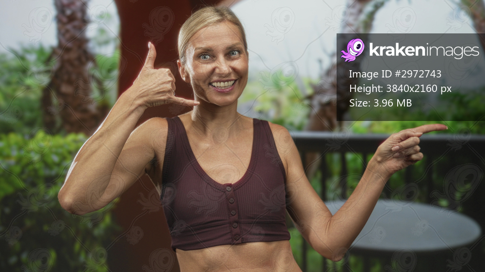 Woman makes call gesture with hand and points to side on building balcony wearing burgundy tanktop; playful invitation.