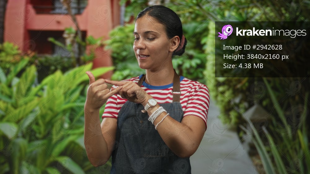 Woman makes call me hand gesture with thumb and little finger near ear while wearing striped shirt and denim apron in building; friendly communication. - Kraken Images