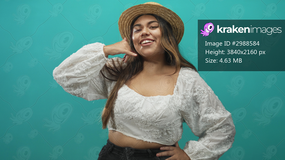 Woman makes call me hand gesture wearing straw hat and white embroidered crop top against a teal studio backdrop, smiling with eyes closed; playful confidence. - Kraken Images