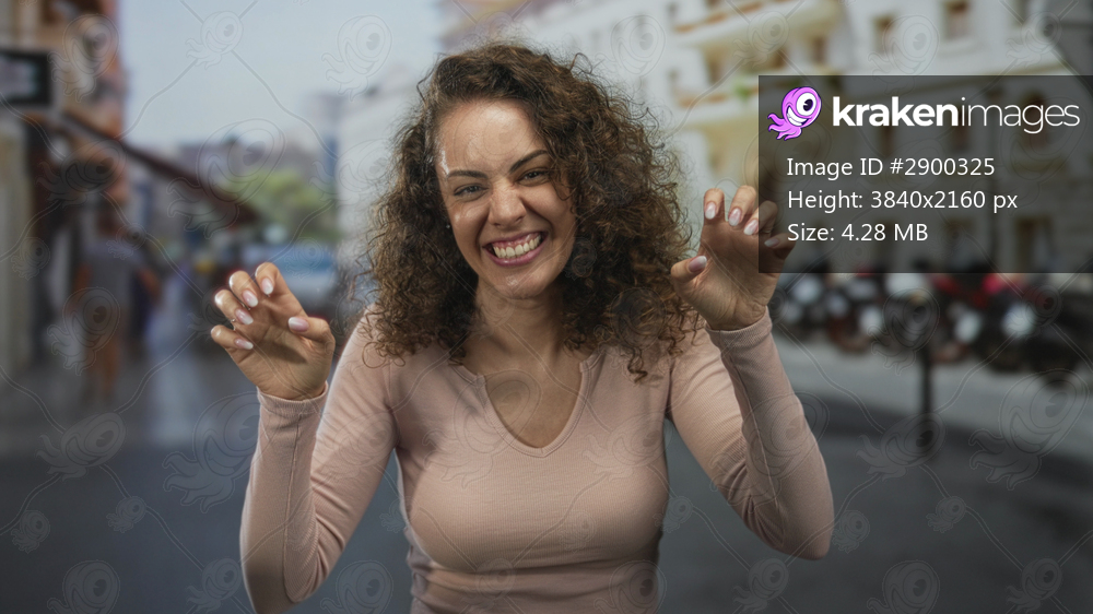 Woman makes claw gesture with hands on a city street in front of buildings, grinning and playfully snarling toward camera; playful mischief.