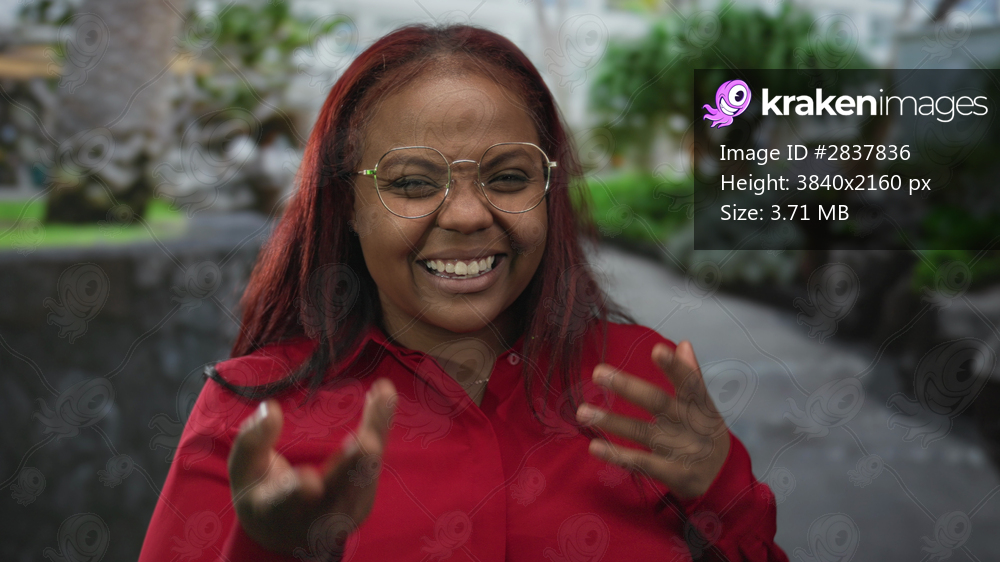 Woman makes expressive hand gesture while speaking in building atrium surrounded by green foliage and stone benches; joy.