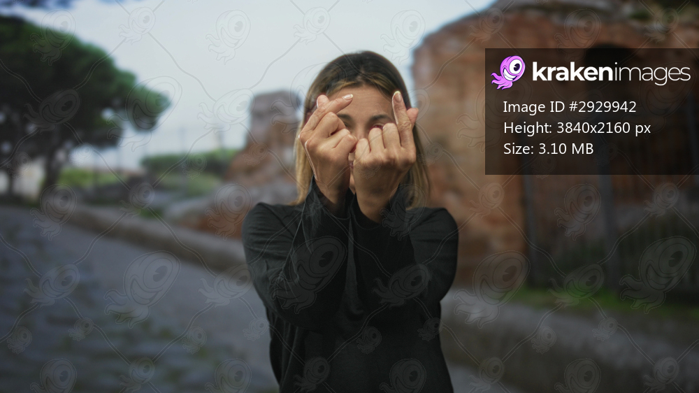 Woman makes finger heart gesture with fingers and hands on cobblestone street by old building and iron gate; playful joy.