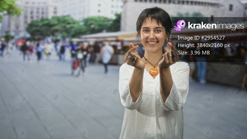 Woman makes finger heart gesture with hands and orange pendant necklace on a busy street market; warmth connection joy.