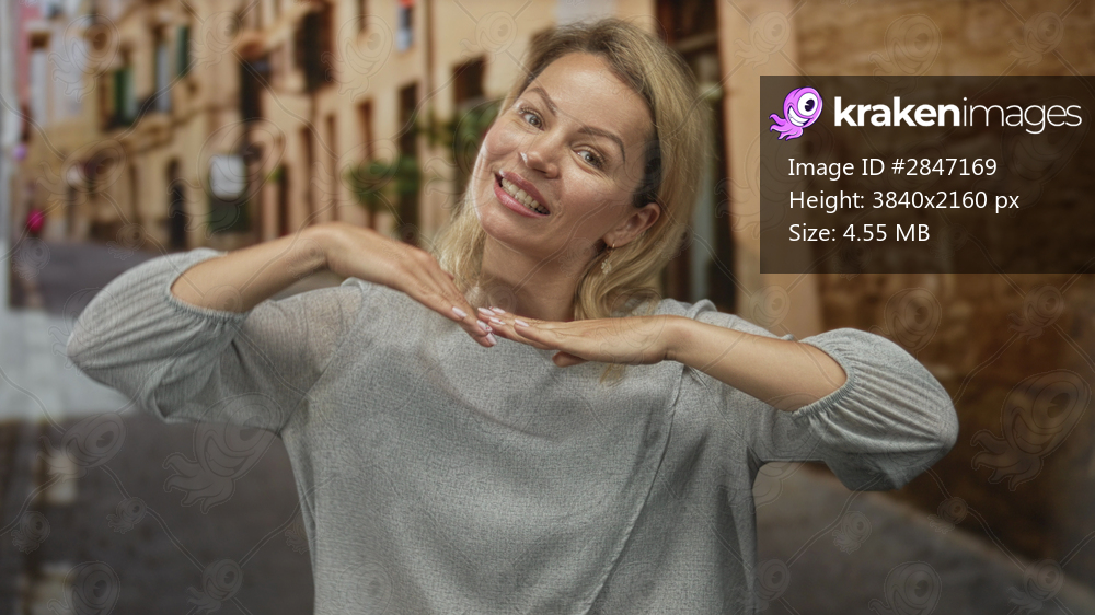 Woman makes heart gesture with fingers and holds up peace sign on a street in an old town; happiness.