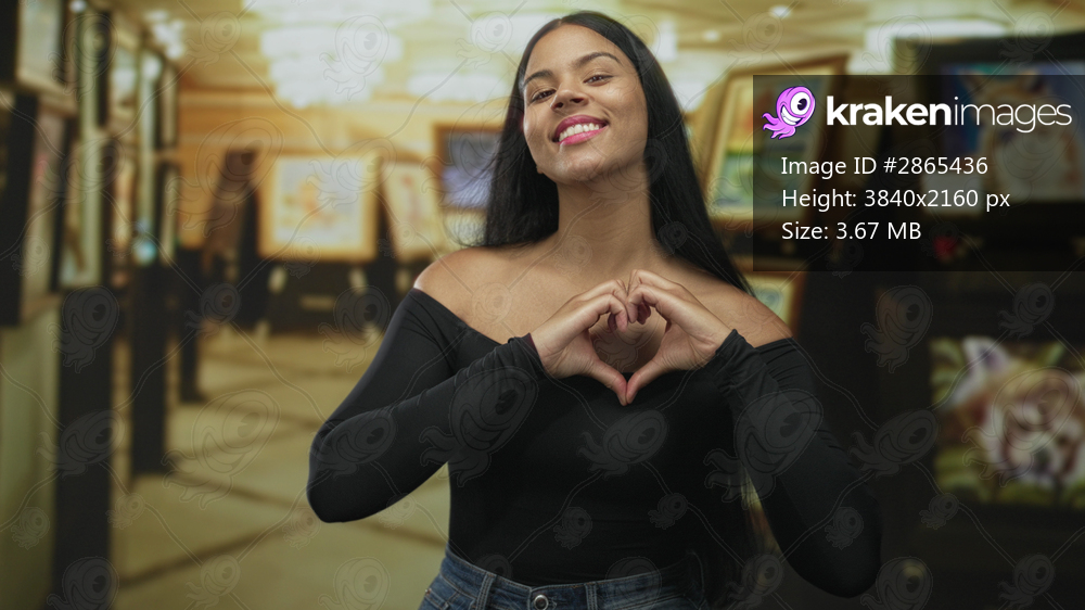 Woman makes heart gesture with hands over modern painting revealing bare shoulder in gallery building; affection.