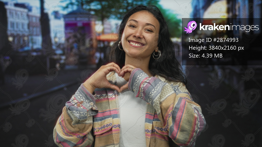 Woman makes heart with hands and points forward on a busy city street while smiling at camera and showing bare hands; joy affection.