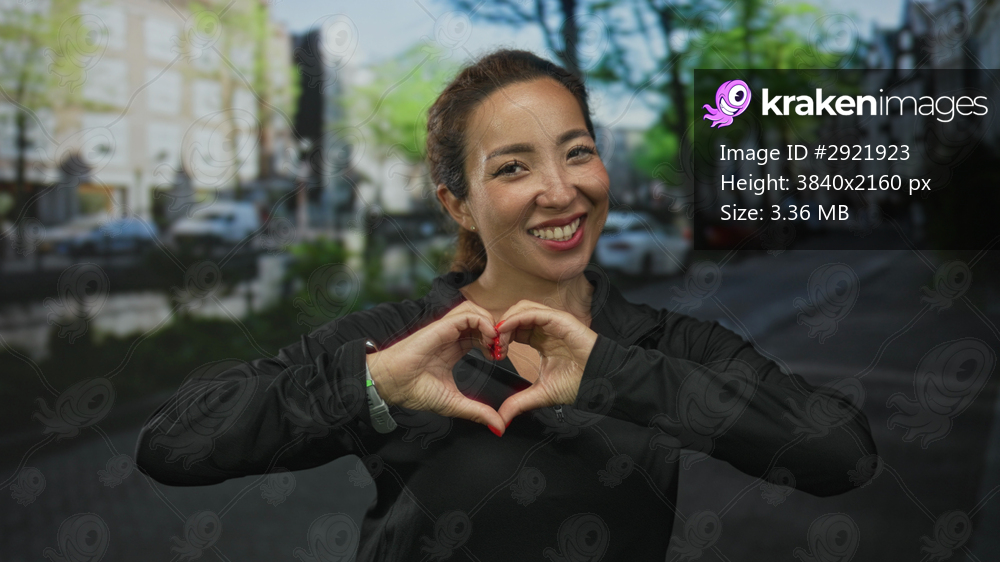 Woman makes heart shape with hands on an urban canal street beside parked cars and trees, smiling directly at camera in daylight; love joy.