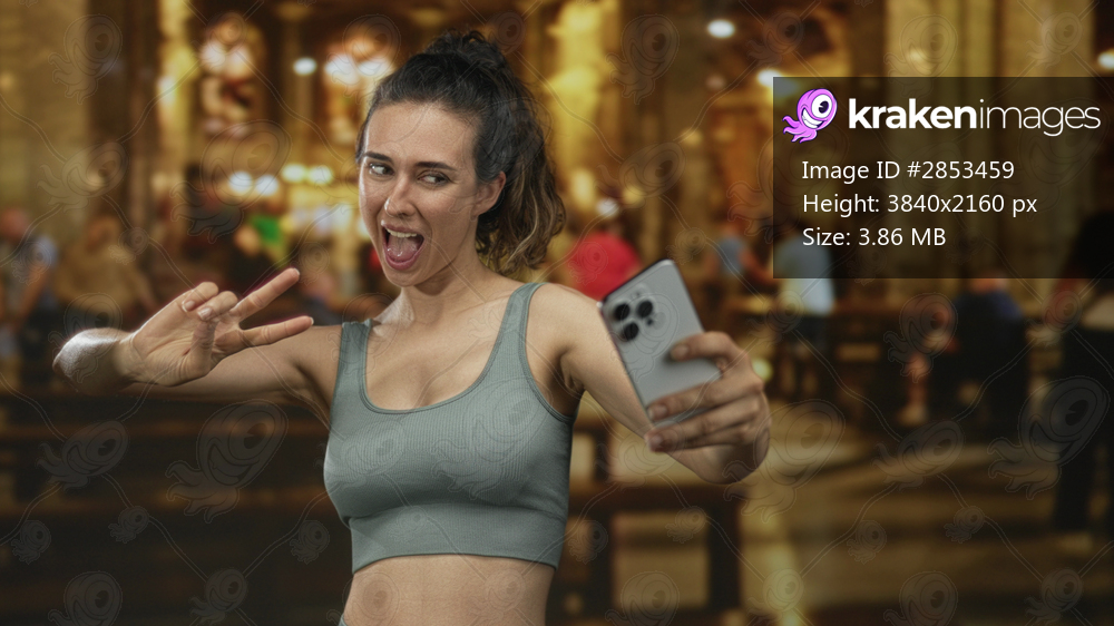 Woman makes heart shape with hands while smiling holding smartphone in church building; spiritual joy.