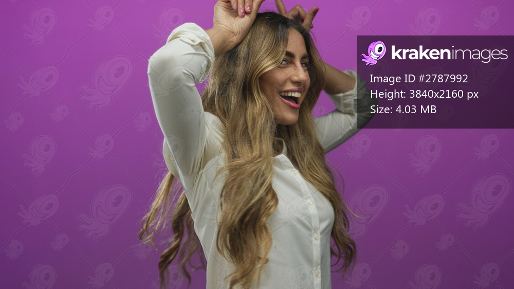 Woman makes horns gesture with hands in studio; playfulness joy.