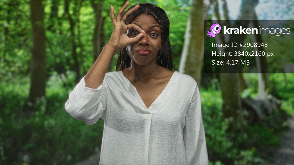 Woman makes ok gesture with fingers around one eye in a forest park wearing a white blouse; playful curiosity.