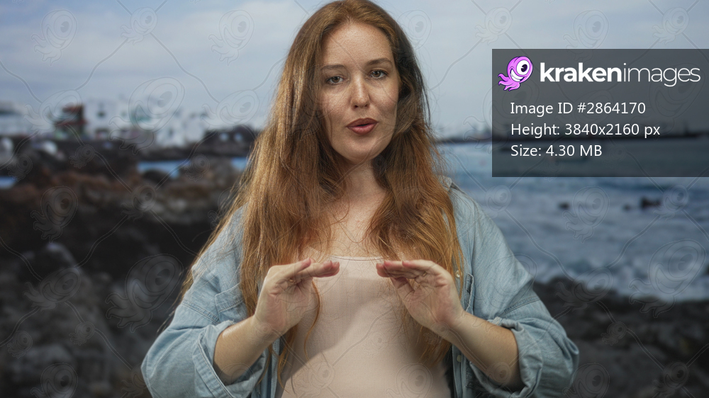 Woman makes ok sign with hands while standing on rocky seaside coast by gentle waves lapping the shore; approval.