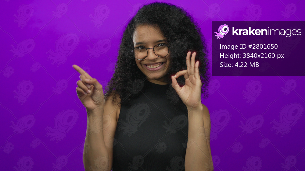 Woman makes ok sign with her hand and points finger aside against purple studio wall; confidence approval.