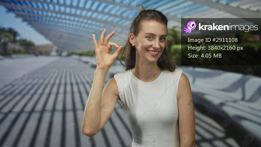 Woman makes ok sign with right hand near face on street pavilion walkway, smiling in white sleeveless top and pearl earring; joy.