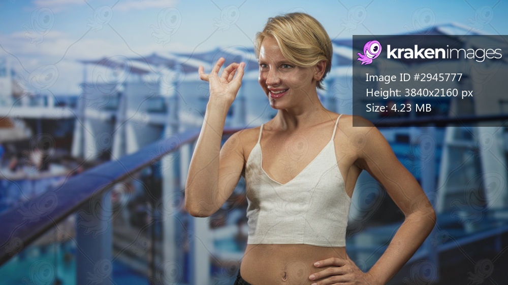 Woman makes ok sign with right hand, points upward in frames and rests left hand on hip on cruise ship deck by pool; vacation joy.