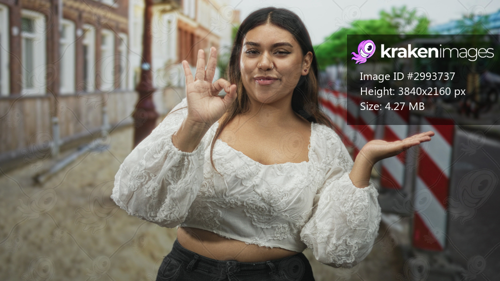 Woman makes ok sign with right hand, shows open palm and bare midriff on a street with construction barriers and buildings; confidence playfulness.