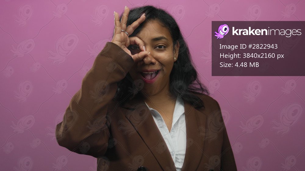 Woman makes ok sign with right hand while smiling warmly at camera in pink studio setting; approval.