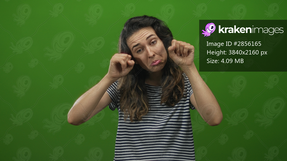 Woman makes punching gesture with clenched fists and tilts head in vibrant green studio space; frustration.
