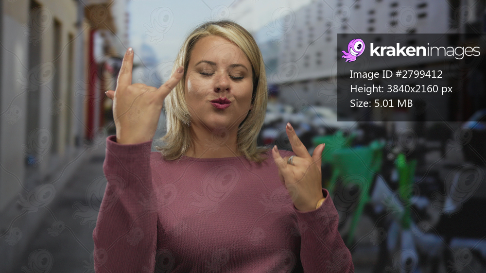 Woman makes rock horns gesture with bare hands on street scene with blurred buildings behind; rock attitude.