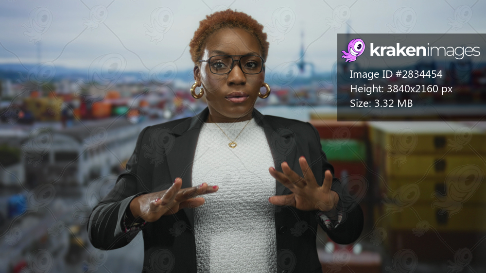 Woman makes slow breathing gesture with both hands raised in front of her at a maritime container port; tranquility.