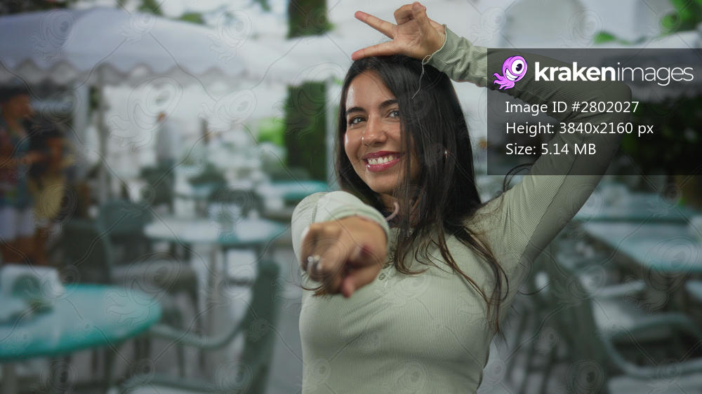 Woman makes victory sign with hand on street terrace under umbrellas outdoors; triumph peace solidarity joy.