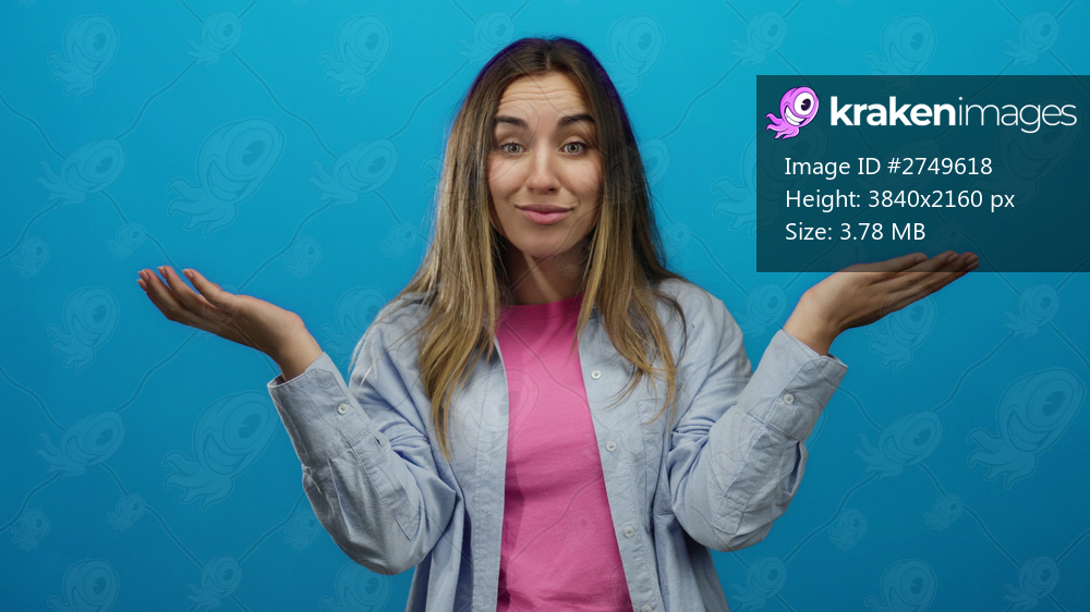 Woman making a funny gesture with hands raised in front of a solid blue background wearing casual clothes reflecting playful expression.