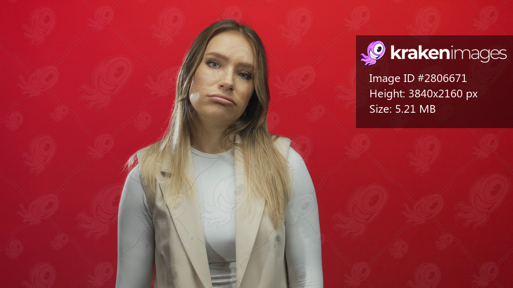 Woman making a gesture with her fingers against a vivid red background, displaying serious expression.