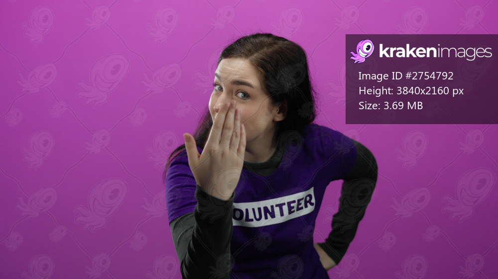Woman making a gesture of calling with her hand wearing a volunteer shirt against a vibrant pink background.