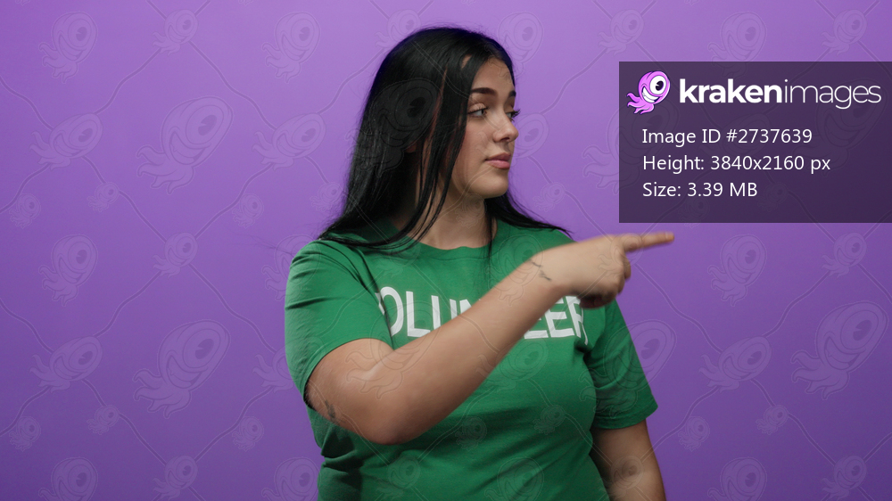 Woman making a gesture to leave with finger pointing over a purple background wearing a green volunteer shirt, expressing confidence and assertiveness. - Kraken Images