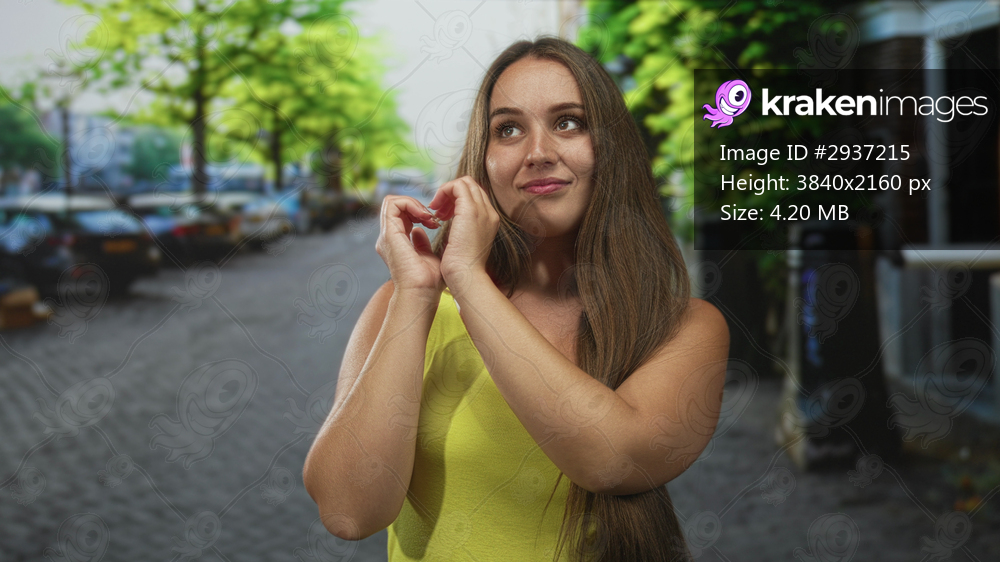 Woman making a heart shape with her hands while smiling on a cobblestone street in the city wearing a yellow tank top; love.